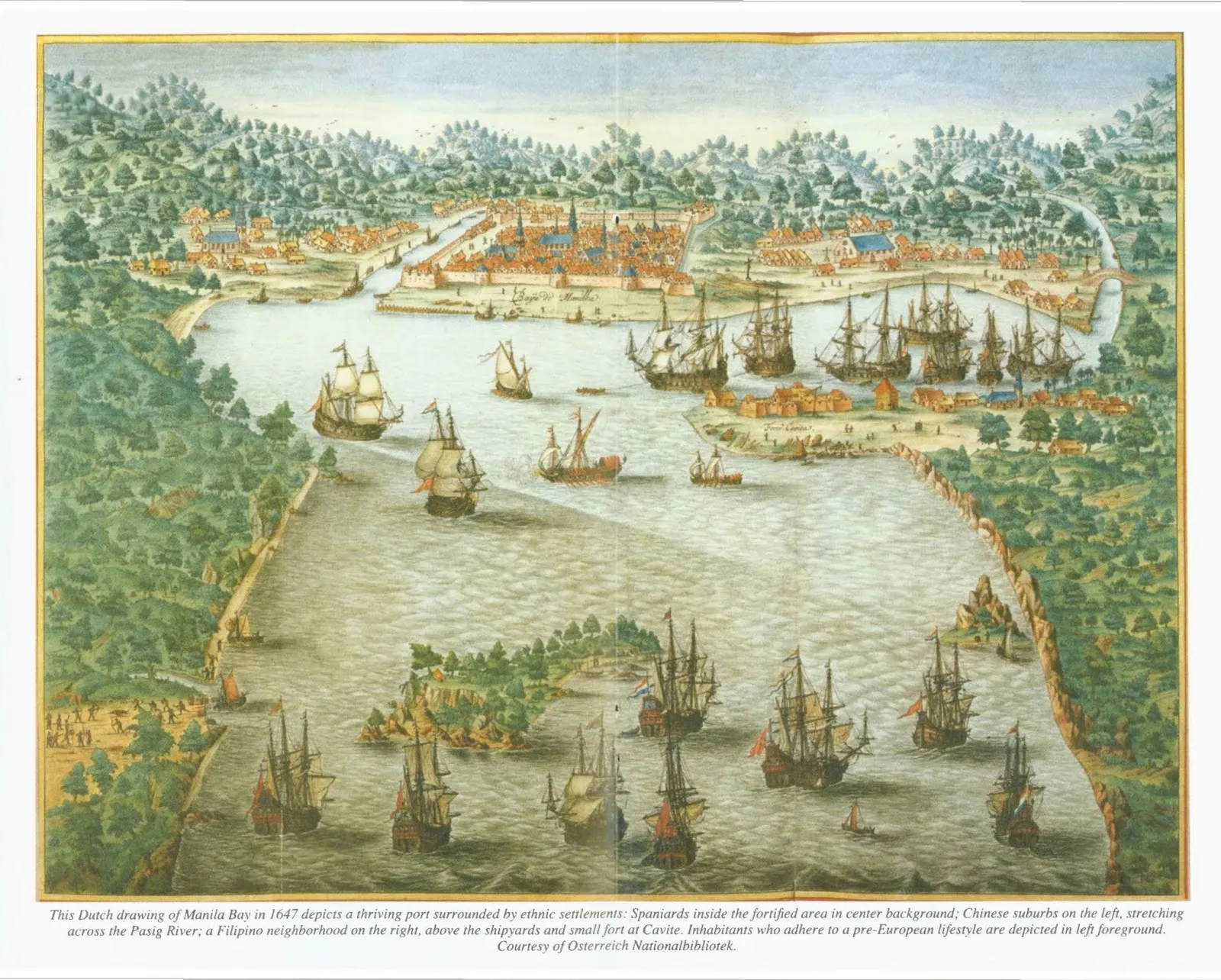 A 1647 plate of Manila Bay published by the Dutch East India Company. Large European square-rigged ships are at anchor. From the book Treasures of the San Diego (1997).