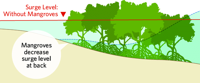 Graphic By Siddharth Narayan for his study "Valuing the Flood Risk Reduction Benefits of Florida's Mangroves" thats shows how magroves protect coastal areas from flooding when sealevels rise due to heavy rainfall or earthquakes