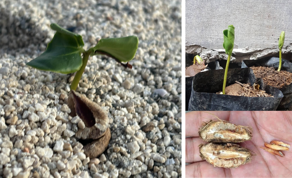 Seedling and pod found on Dolomite beach(left) compared to Talisay Seedling about to unfurl(top right)