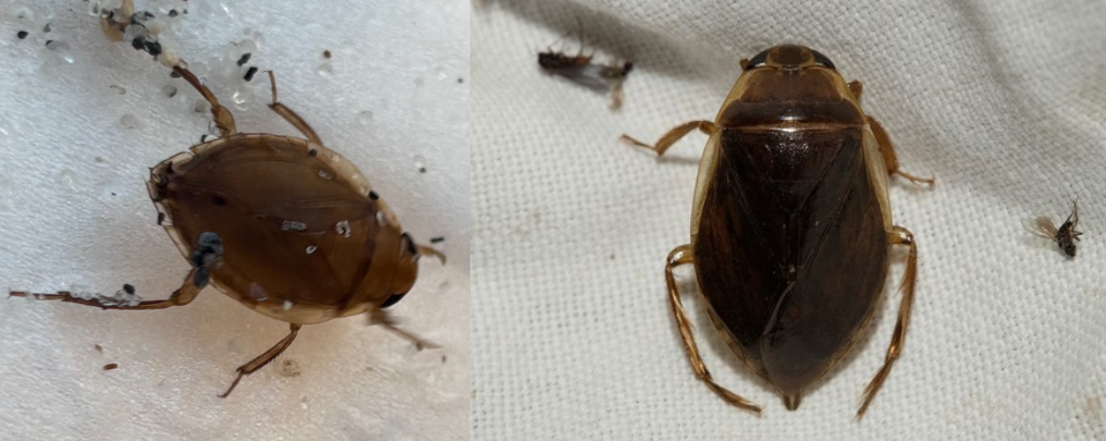 Bug from dolomite beach on styrofoam (left) compared to Diplonychus rusticus specimen surrounded by dead mosquitos (right)